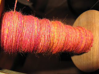 My jones has yet to be satisfied so right now I'm spinning a grafton fibers batt that I recvieved in a swap a while ago. I'm trying to make this a bit thicker just to spice things up a bit. I'll let you know how it goes but here's some beauty shots.